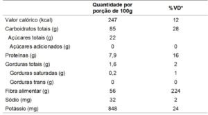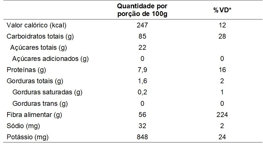 *% Valores diários com base em uma dieta de 2.000 kcal ou 8.400 KJ. Seus valores diários podem ser maiores ou menores dependendo de suas necessidades energéticas.